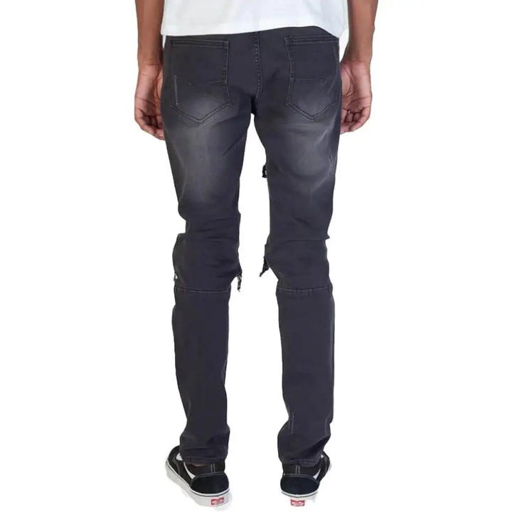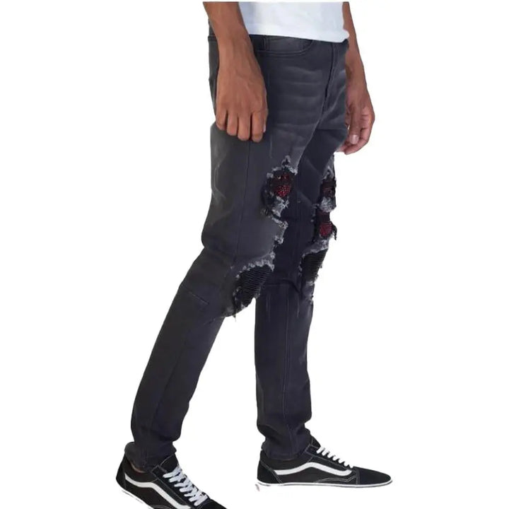 Rips at knees and thigh with rhinestones patches and pintucked patches inside